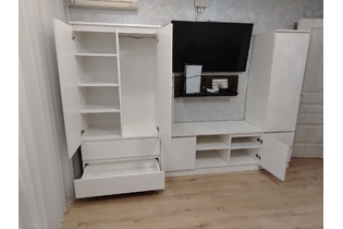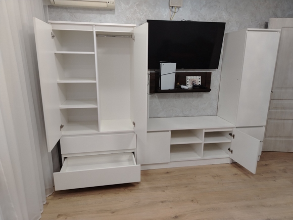 Шкафы гостиной комплектуются удобными полками и штангой для одежды, а так же выкатными ящиками.